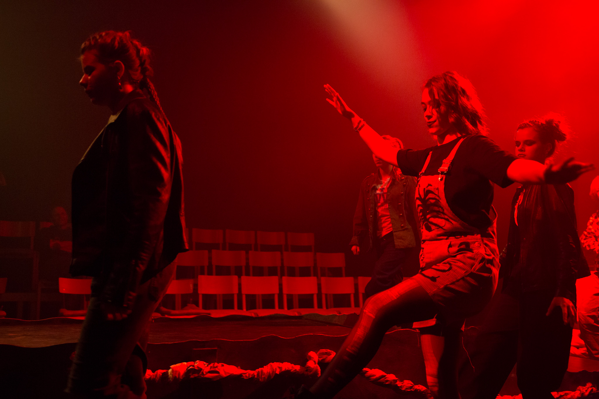 Opvarmningsøvelser, teater- & improvisationslege og i perioder arbejder vi med forskellige